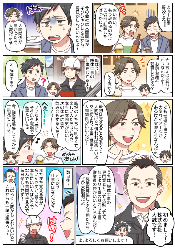 解体工事やアスベスト除去作業が未経験でも、先輩従業員が丁寧に指導していきますので安心してください。